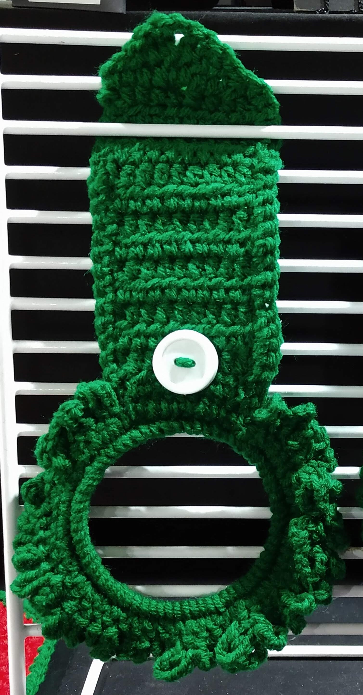 Holder is crocheted using green yarn. Holder loops over handle and button. Towel is then placed through the circler area hanging down.