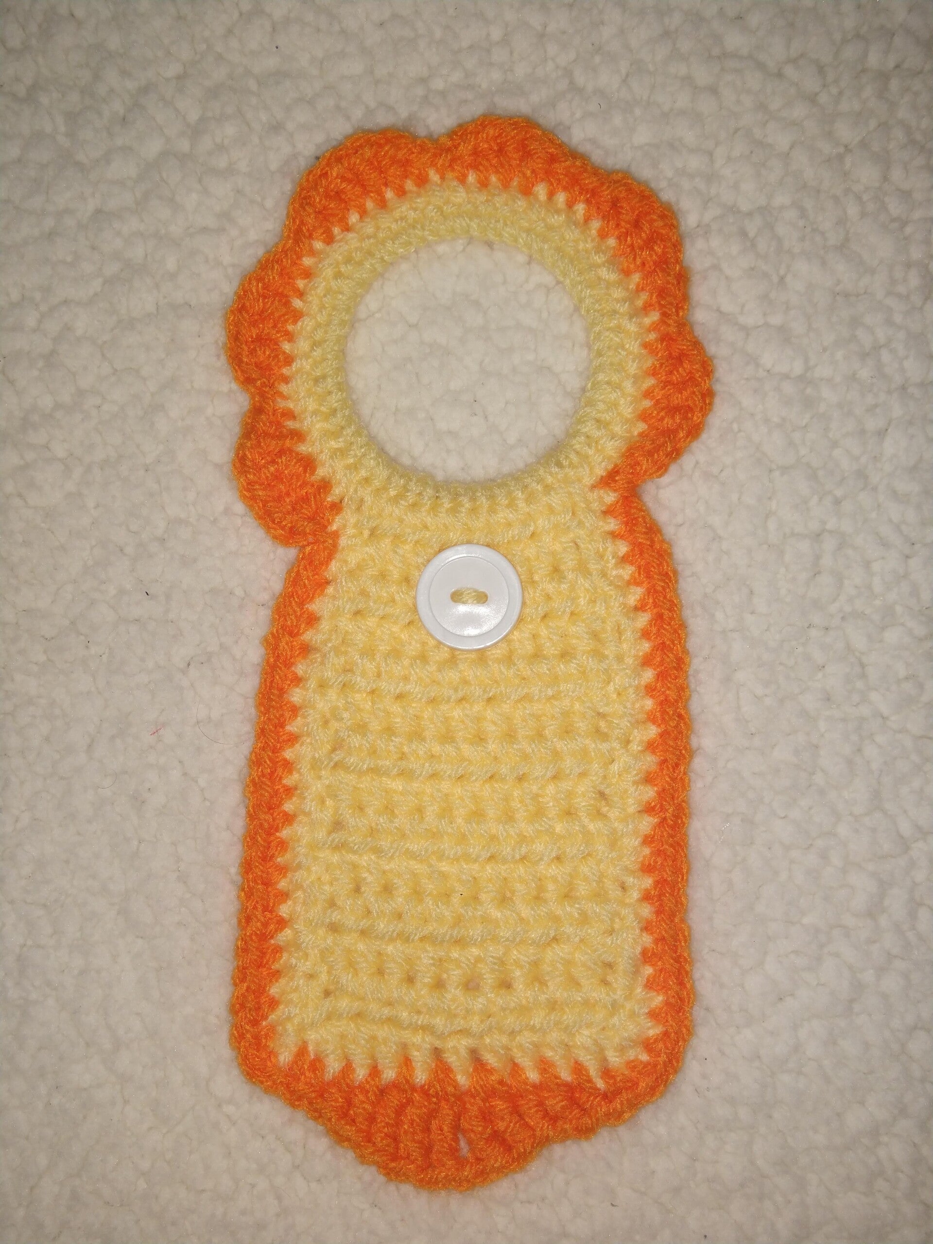 Holder is crocheted using yellow yarn with orange trim. Holder loops over handle and button. Towel is then placed through the circler area hanging down.