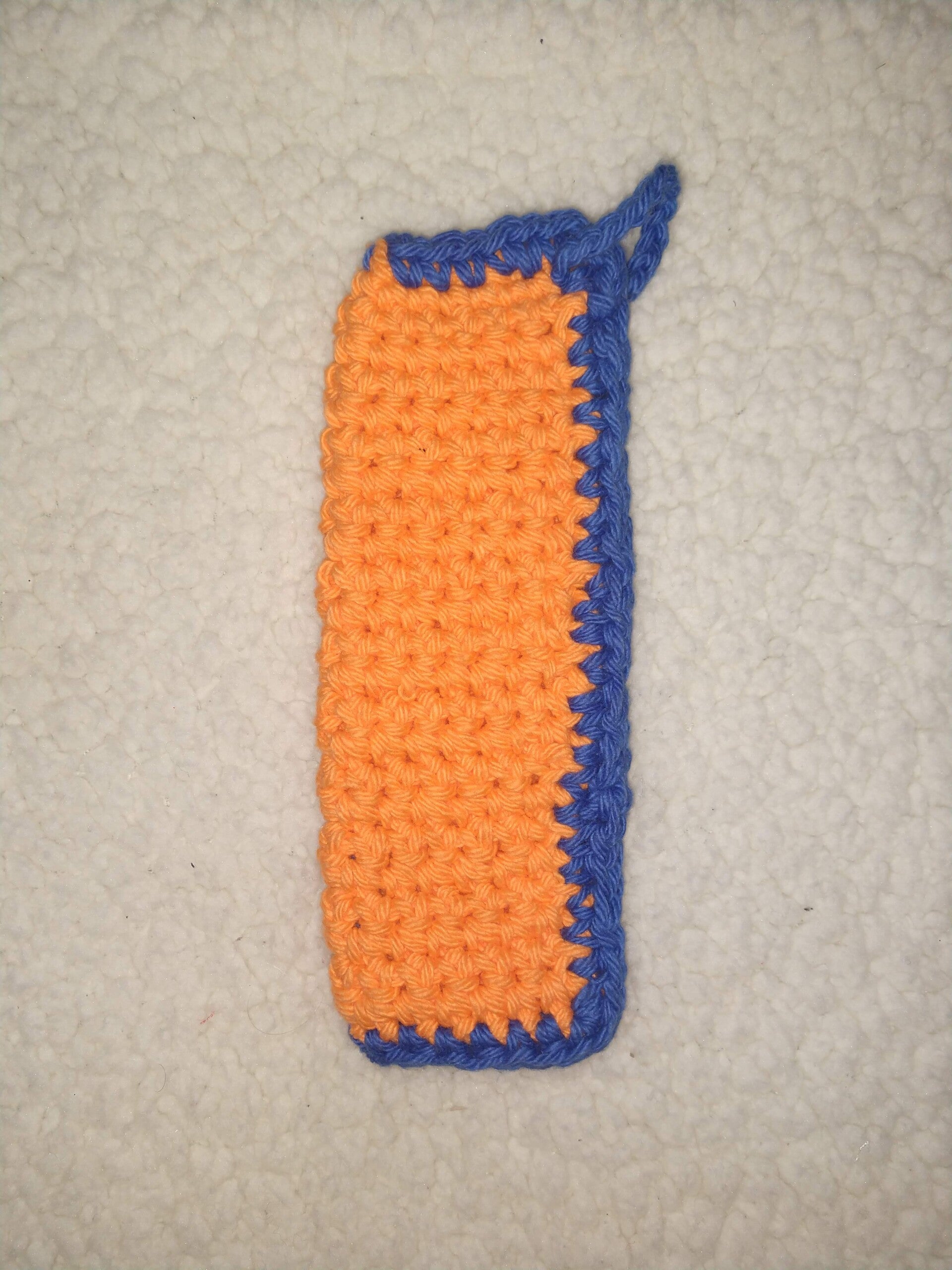 handle pot holder crocheted using orange yarn withblue trim. It can also be used as a holder for you reading glasses.