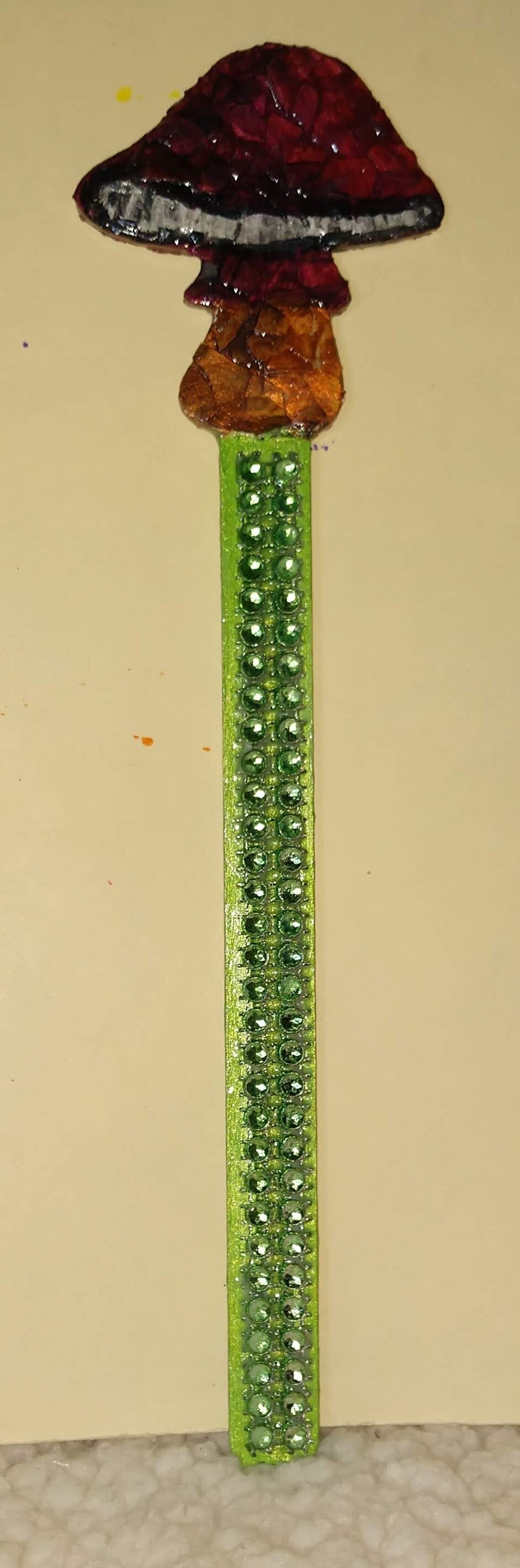 Bookmark is eggshell on a wooden base. Painted with watercolors and sealed. Height 9in. Created 2023
