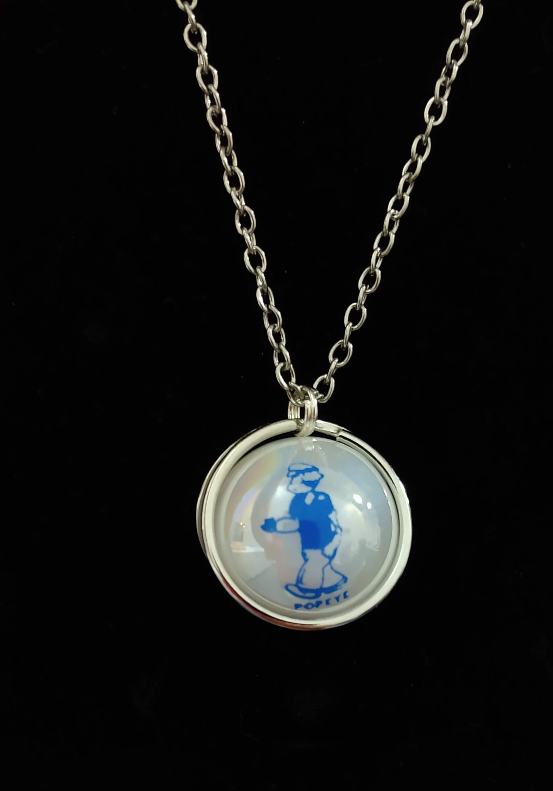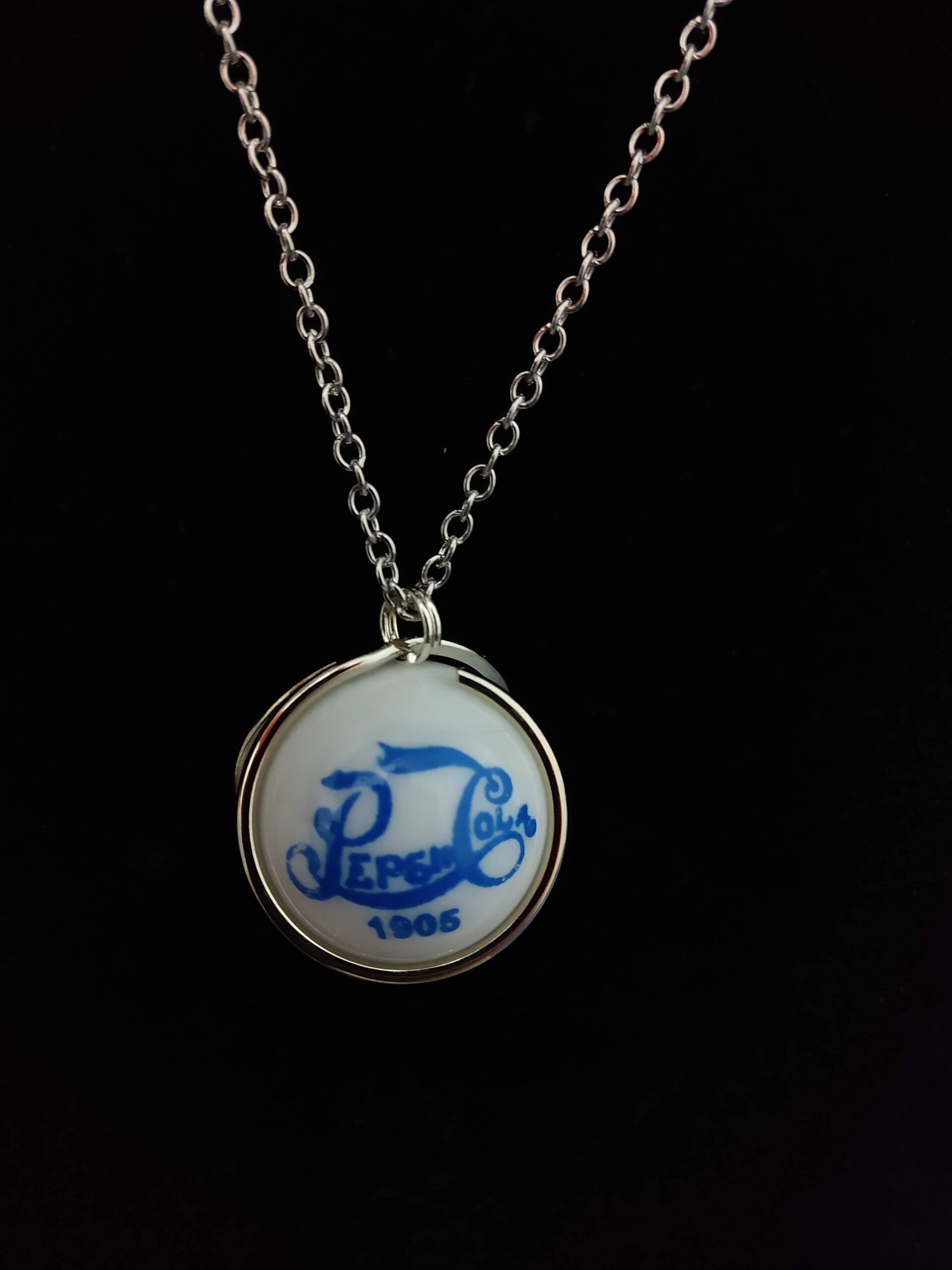 Each necklace is a marble with a logo printed. The necklace come with a 22 inch chain.