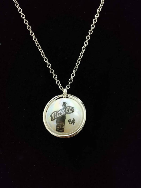 Each necklace is a marble with a logo printed. The necklace come with a 22 inch chain.