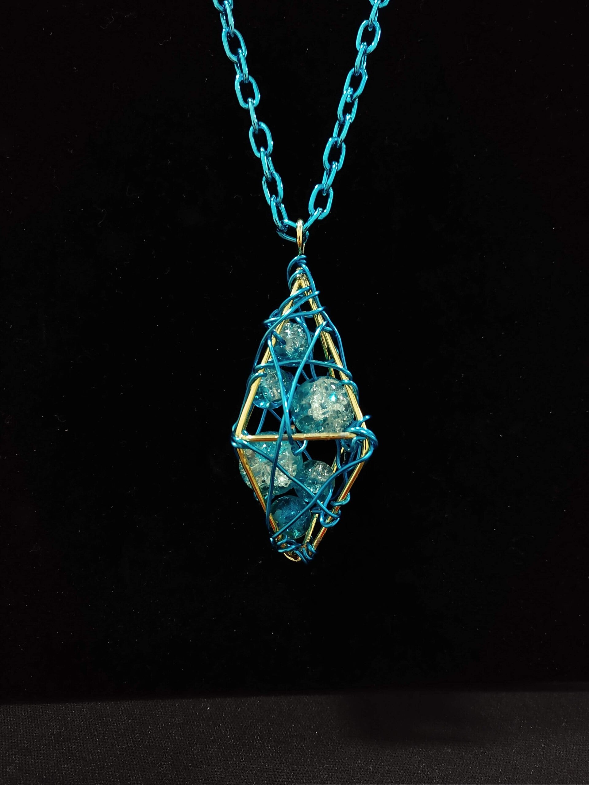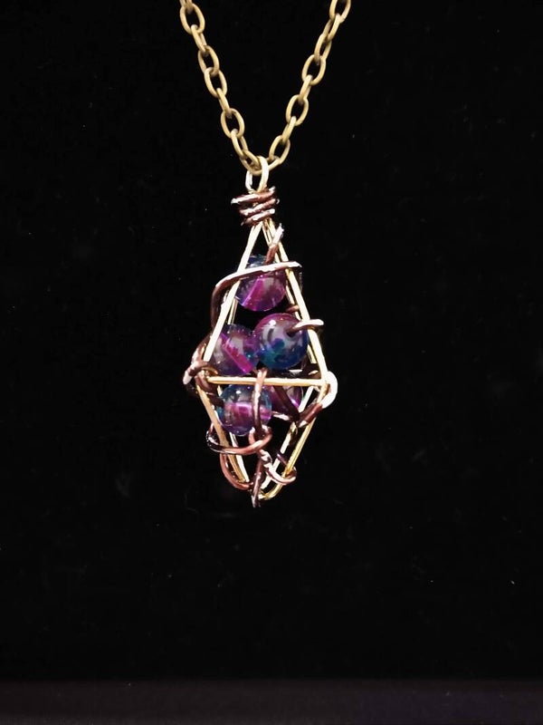 Diamond shaped pendant decorated with wire and beads. Hanging on a 22 inch chain.